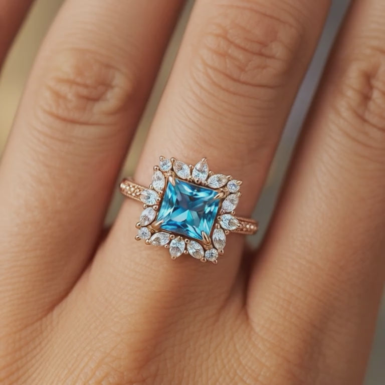 The Aeliana is a breathtaking 5CT princess cut blue moissanite ring, designed to capture attention with its unique sunburst halo and vintage appeal.