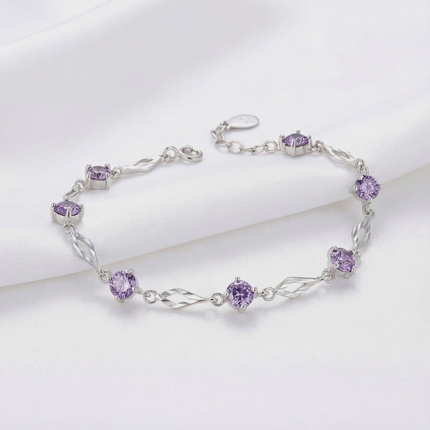 Mined amethysts often vary in shade and clarity, making it nearly impossible to find a perfectly matched set for a station bracelet. We engineered the solution. This bracelet features six precision-cut Simulated Amethysts, color-calibrated to achieve the ideal deep violet hue consistently across every stone. No cloudy inclusions. No pale centers. Just optically perfect saturation.