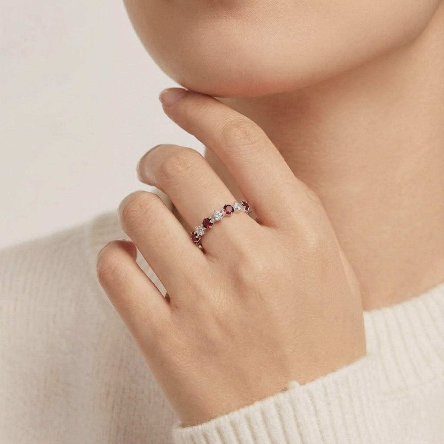 SaleAeliana eternity ring in S925 sterling silver with round cut simulated garnets and clear stones on red velvet.