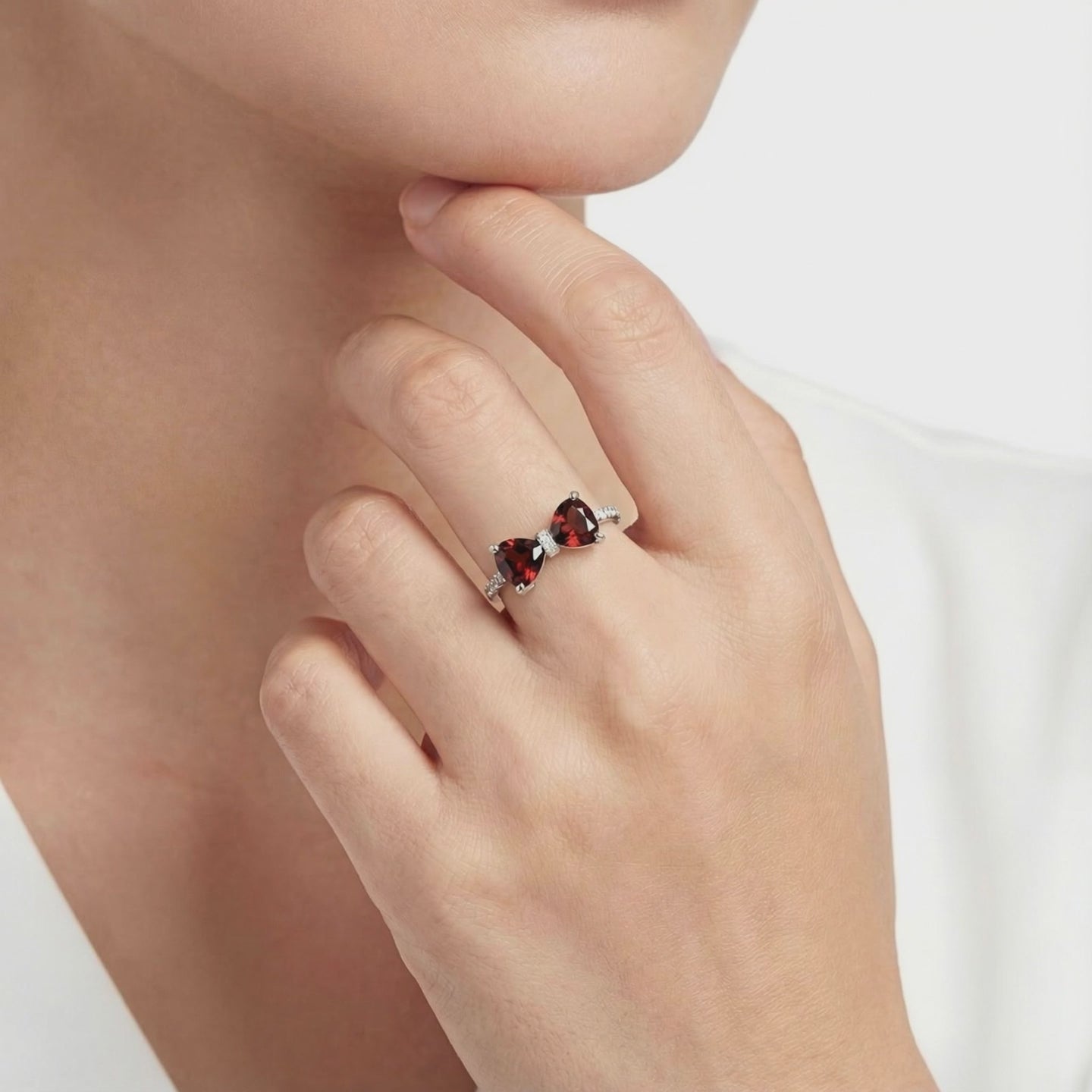 SaleSterling silver bow ring with trillion cut red simulated garnets on red velvet with a blurred candle background.