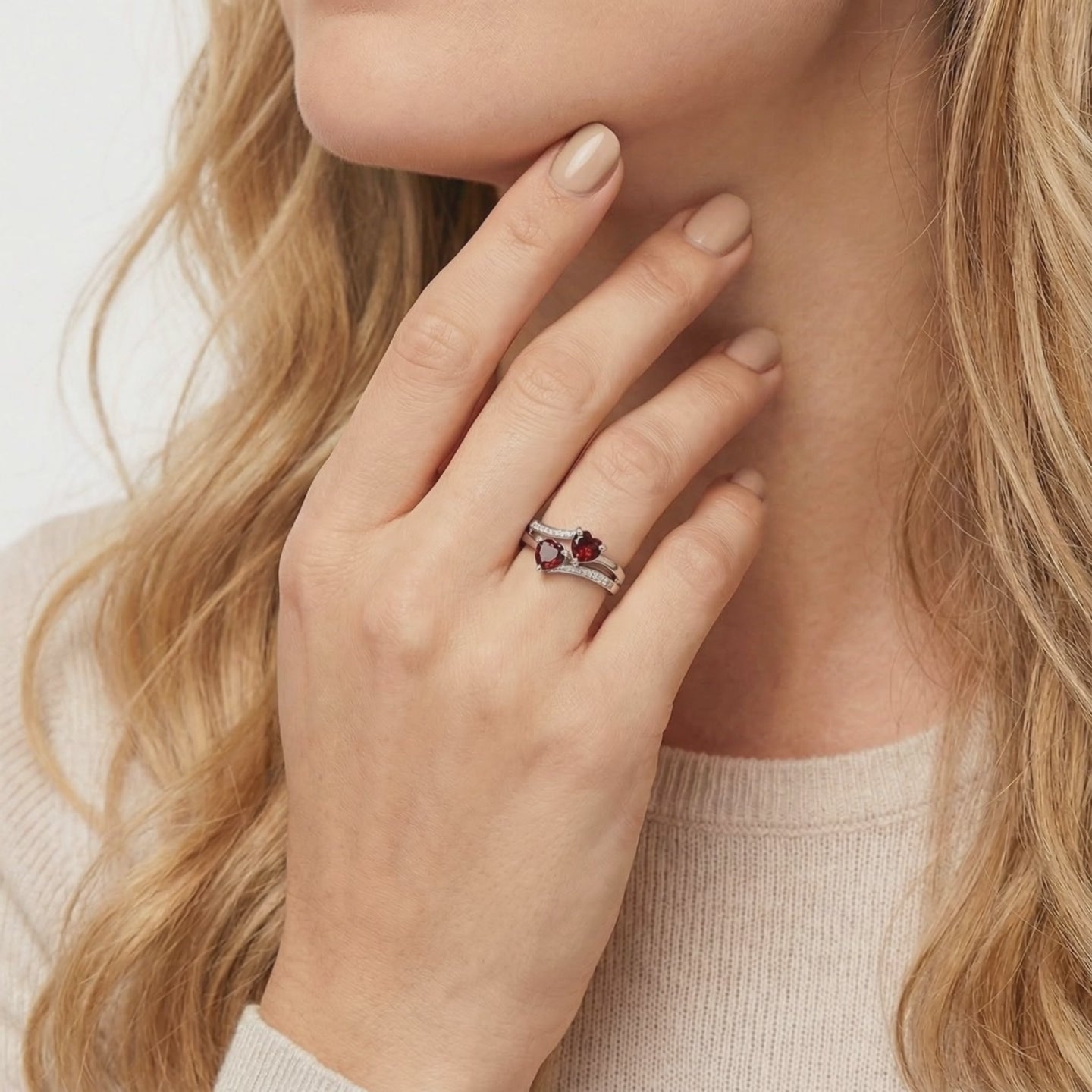 SaleSterling silver bypass ring with two heart cut simulated garnets and pavé accents on a red fabric background.