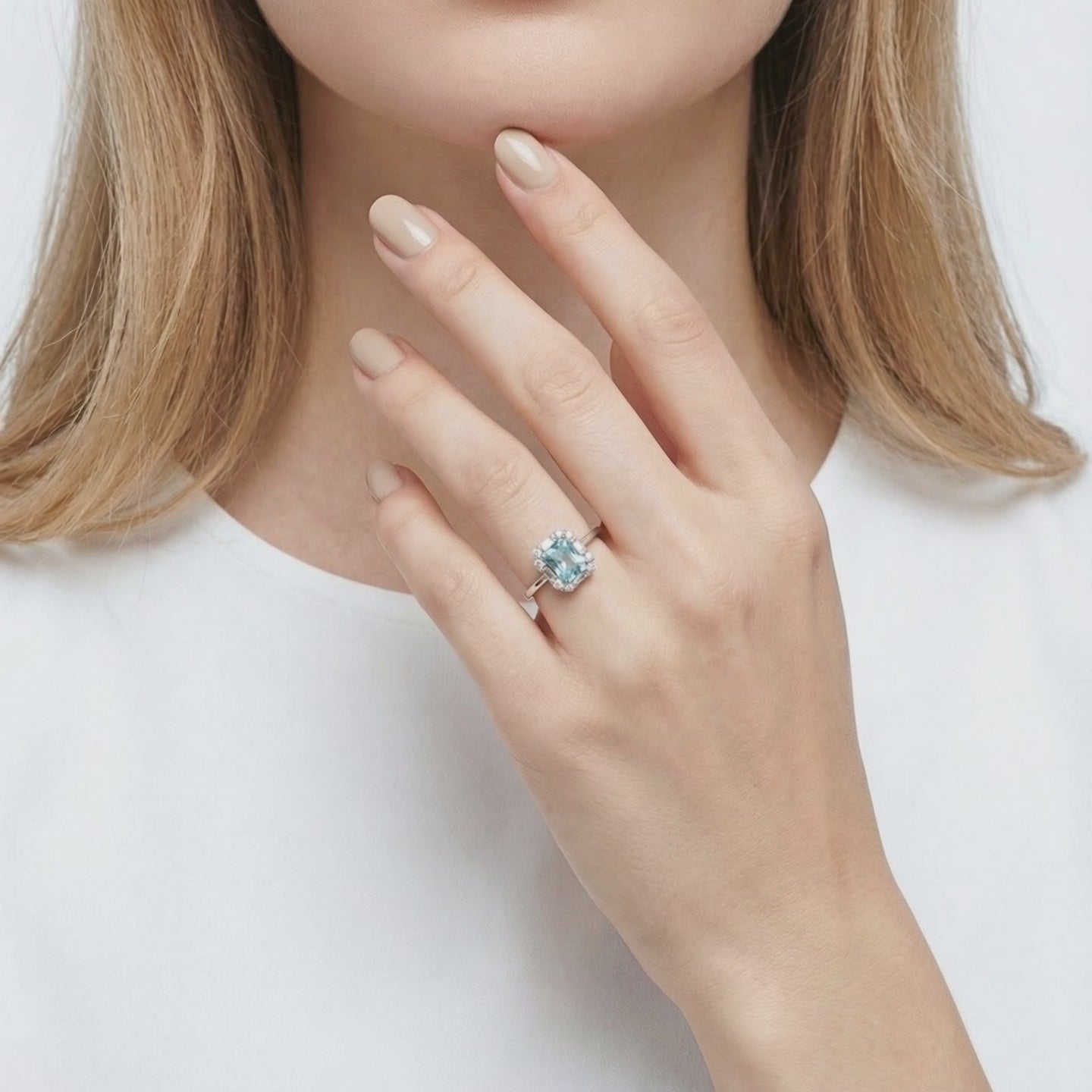 SaleCushion-cut simulated aquamarine halo ring in S925 sterling silver on blue silk and marble.