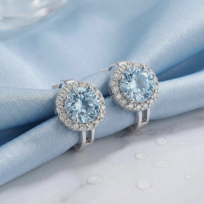 Mined aquamarine is often too pale or clouded by inclusions. These earrings feature Simulated Aquamarine, color-calibrated to achieve the ideal "Sea Water" light blue that nature rarely delivers with this level of VVS clarity. Each center stone is precision-cut to maximize light return and framed by a high-performance halo for superior fire and brilliance.