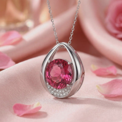 Close-up of the Valisara teardrop pendant's round simulated pink tourmaline and pavé accents in S925 sterling silver.