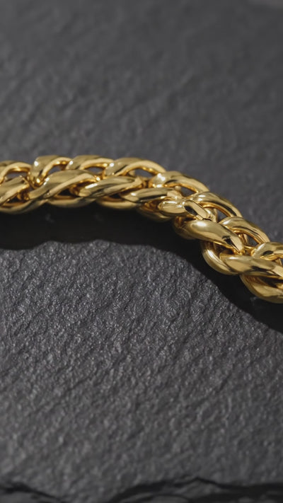 Silver 12mm stainless steel Cuban link bracelet resting on a dark textured rock surface.