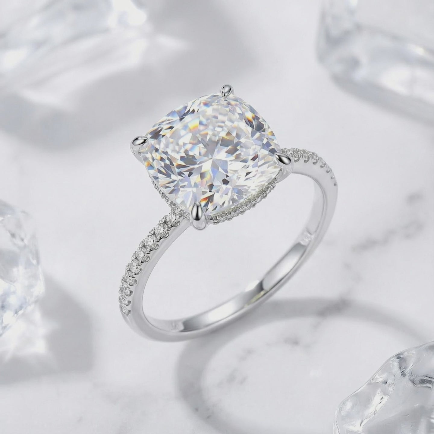 Side profile of the Celestina cushion cut ring showing the hidden halo and pavé S925 sterling silver band.