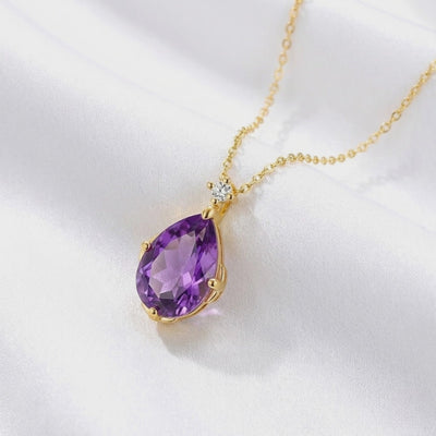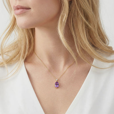 Close-up of a pear-cut simulated amethyst necklace pendant in an 18K gold vermeil setting.