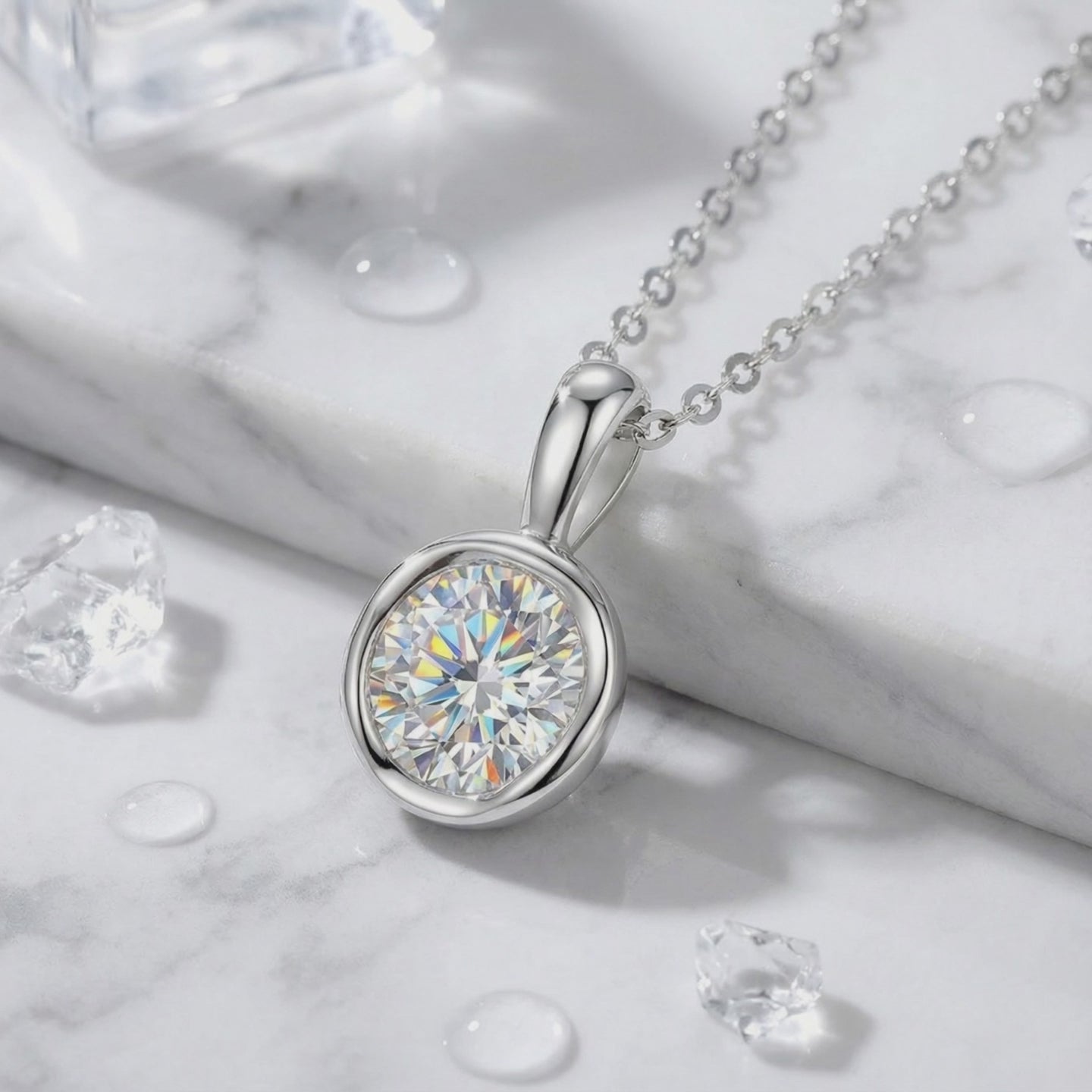 Close-up of a 1CT round simulated diamond in a sterling silver bezel pendant on a white marble background.