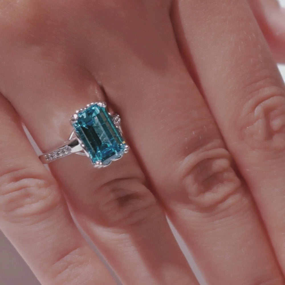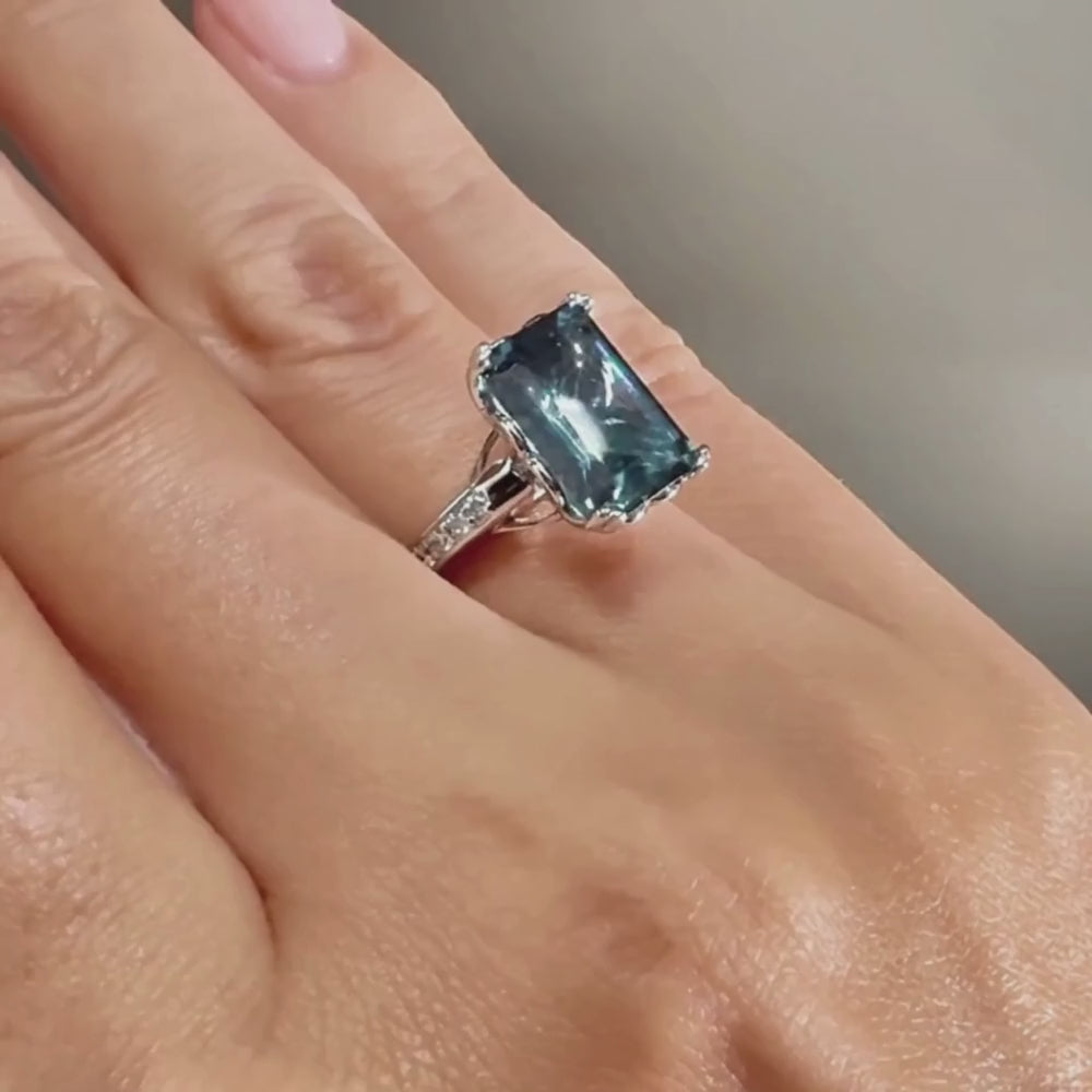 Der Azure Dream vereint Stil und Eleganz mit seinem Halb-Ewigkeitsring. Dieser Ring aus 925er Sterlingsilber besticht durch einen auffälligen, smaragdgrünen Saphir-Imitat, der sicher mit Krappen gefasst ist, und simulierte Diamanten an der Seite des Hauptrings in einer Kanalfassung.