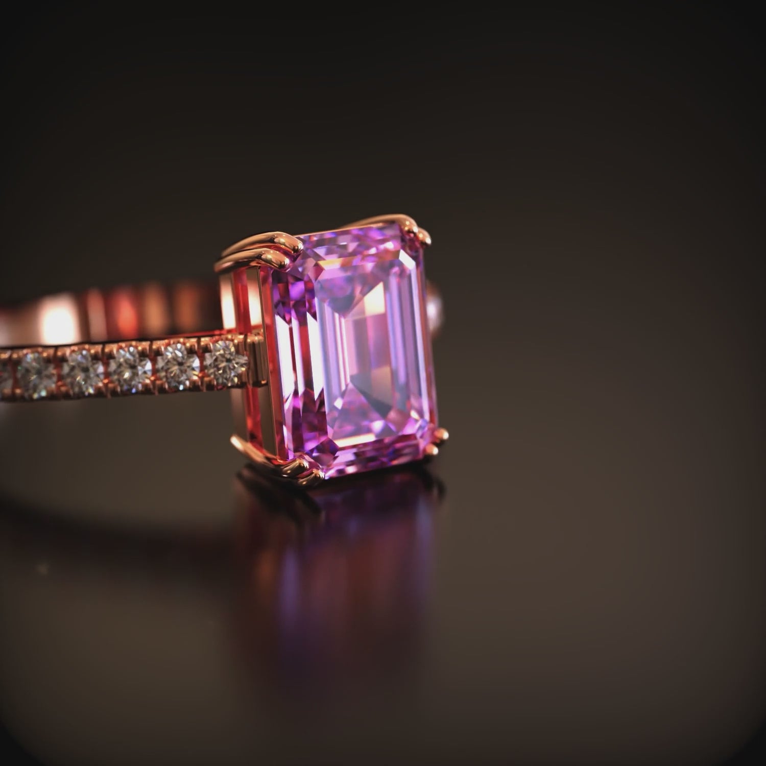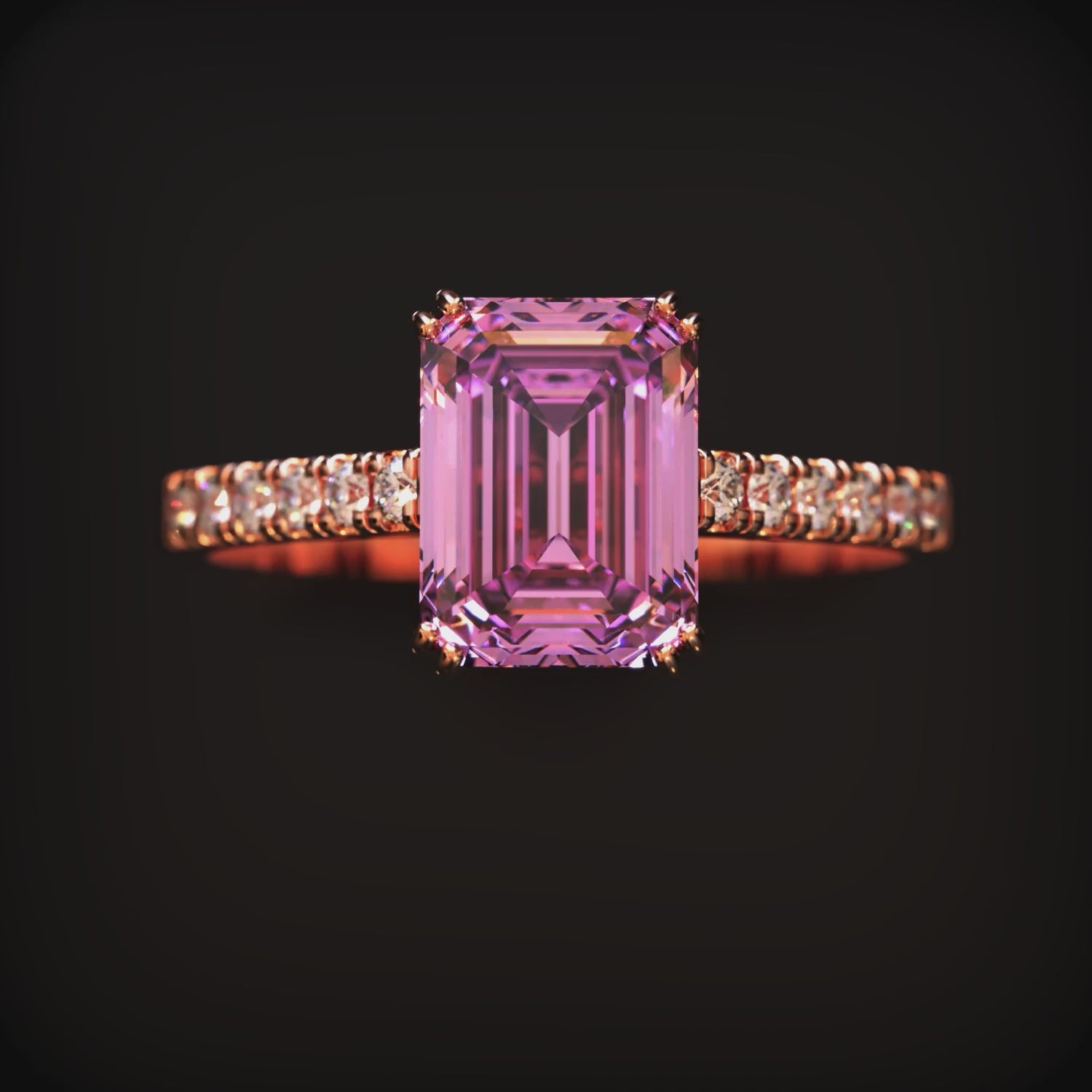 Der Elisa-Ring ist ein atemberaubendes Schmuckstück mit einem beeindruckenden Moissanit-Mittelstein im Smaragdschliff in einem auffälligen Rosaton. Dieses exquisite Schmuckstück besticht durch seine leuchtende Farbe und sein makelloses Funkeln und bietet eine luxuriöse Alternative zu traditionellen Diamanten zu einem unschlagbaren Preis. Der Stein ist in ein Roségold-Vermeil-Band eingefasst, das die Brillanz verstärkt und für lange Haltbarkeit sorgt.
