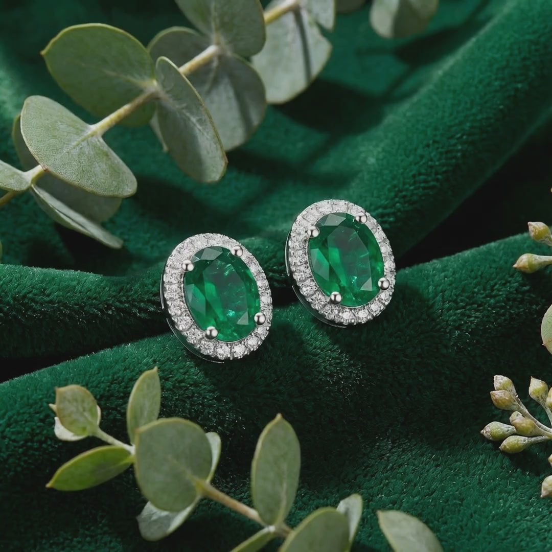 Close-up of oval simulated emerald halo studs in S925 sterling silver showing the side profile and earring posts.