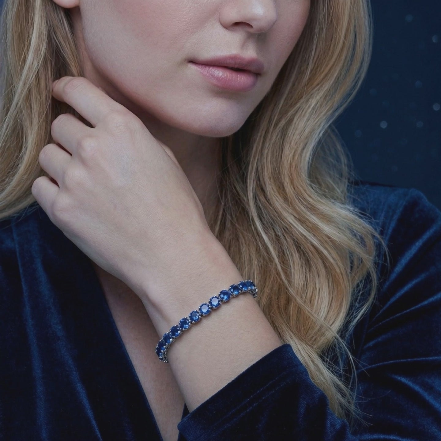 SaleOval simulated sapphire and sterling silver tennis bracelet on a dark blue velvet background.Close-up of oval-cut simulated blue sapphires and round white stones in a sterling silver tennis bracelet.