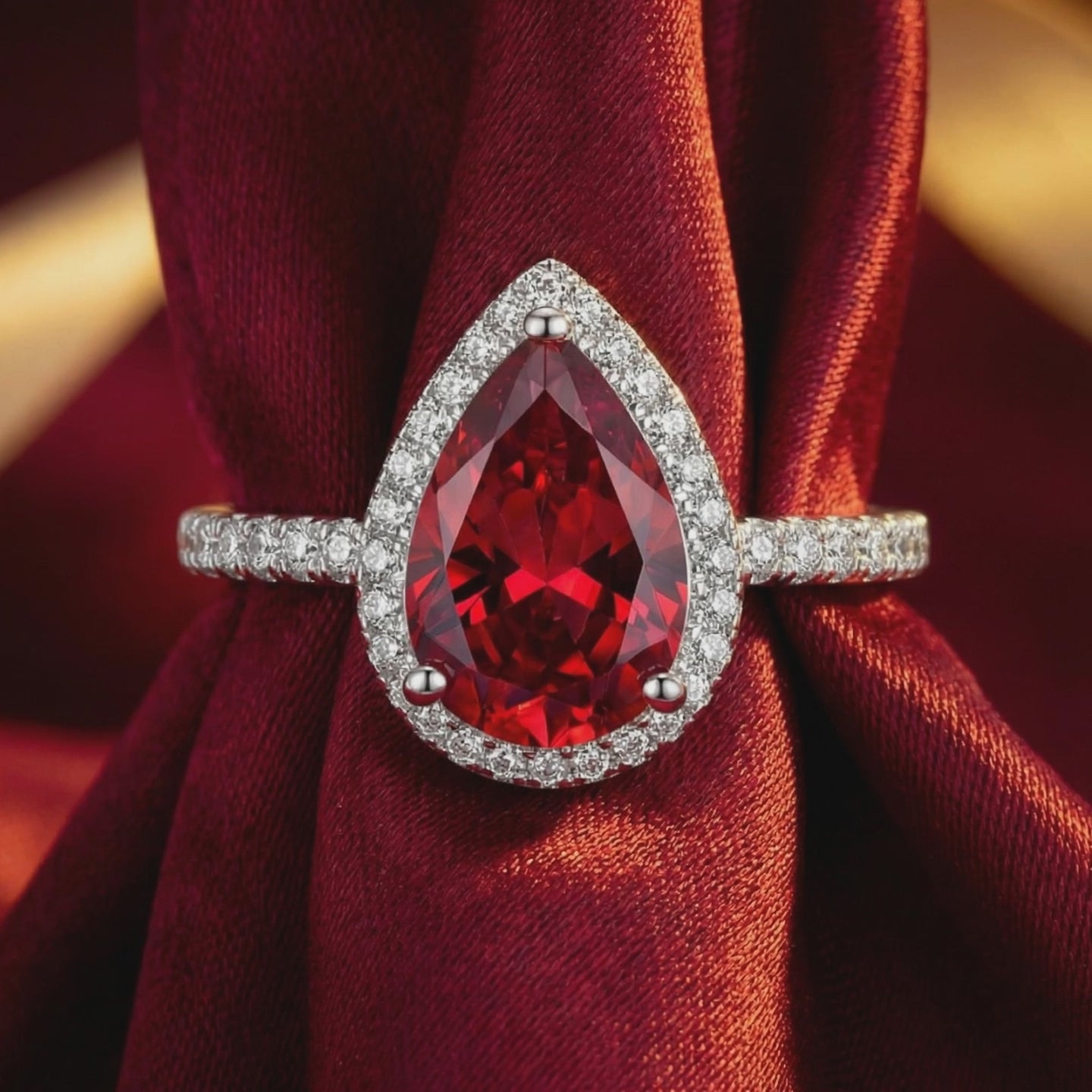 • Center Stone: High-Performance Simulated Ruby (Pear Cut)