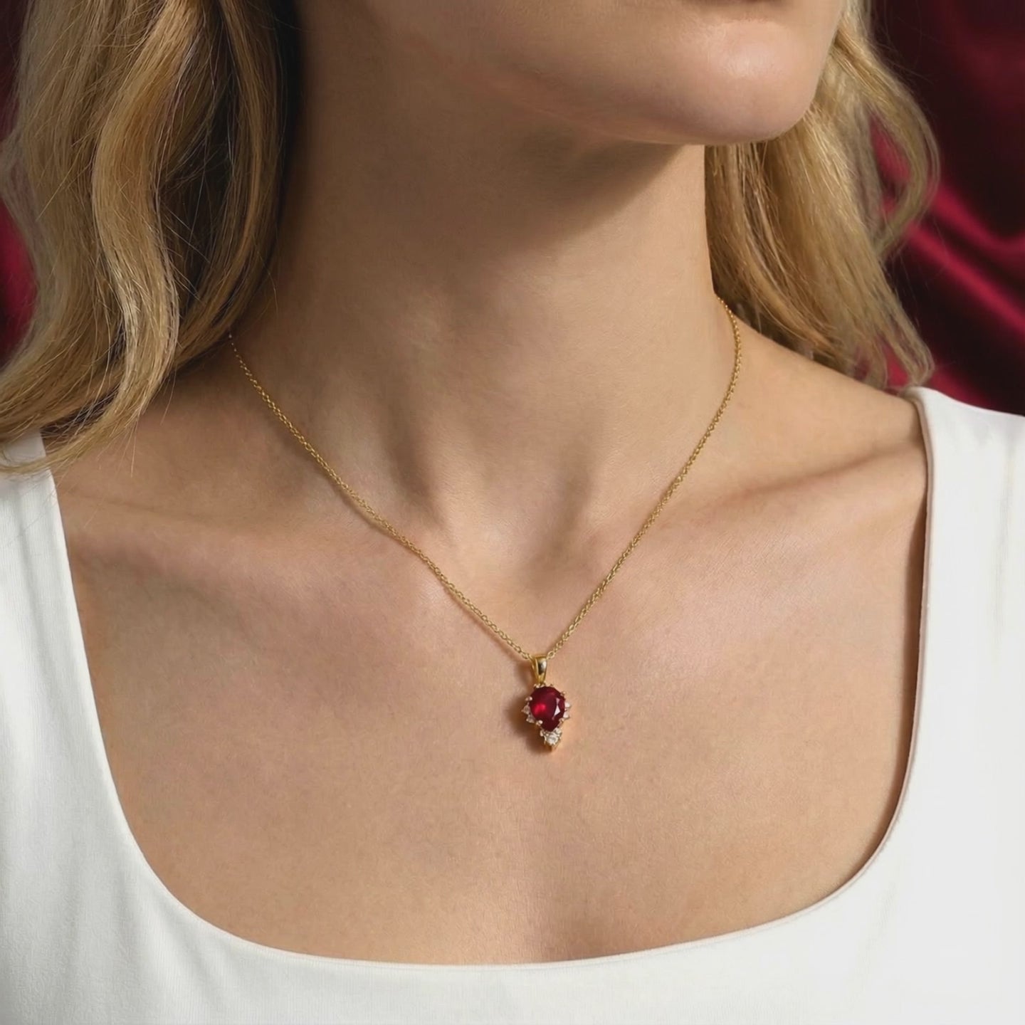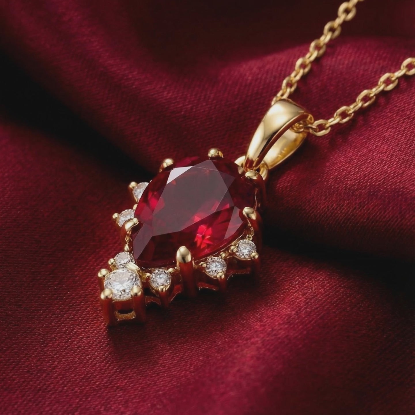 Mined rubies are notoriously inconsistent. Most are cloudy, filled with fractures, or lean toward an earthy brown. We engineered the alternative. This July birthstone necklace features a Pear Cut Simulated Ruby, color-calibrated to the museum-grade "Pigeon Blood" benchmark for intense red saturation and flawless clarity.