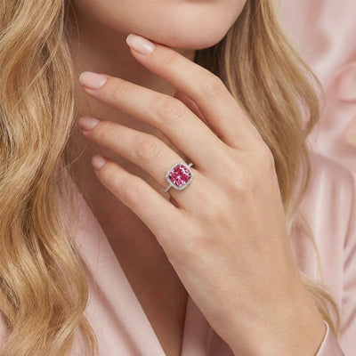 Mined pink tourmalines are rarely flawless; they often carry "silk" inclusions that dull their natural brilliance. We engineered a solution. This ring features a Simulated Pink Tourmaline, color-calibrated to achieve a vivid raspberry hue with exceptional clarity. Every facet of the cushion cut is precision-aligned to maximize light return, delivering a level of optical perfection that nature rarely produces consistently.