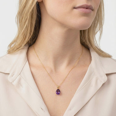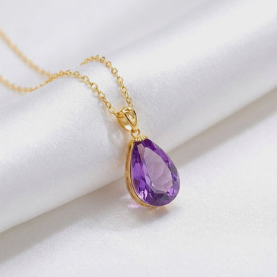 The Vesperia teardrop simulated amethyst necklace in 18K gold vermeil resting on white silk.