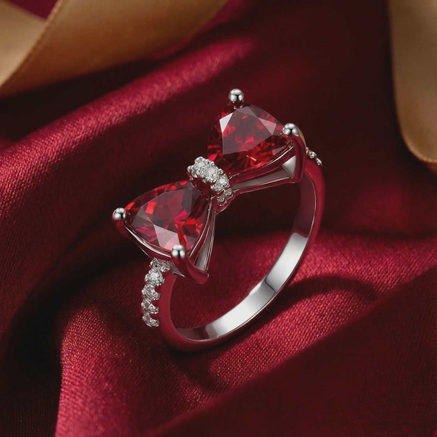 Nature rarely delivers the deep, saturated "Pigeon Blood" red found in museum-grade rubies without significant inclusions. This July birthstone ring is engineered to solve that inconsistency. We use color-calibrated A5 Simulated Ruby, precision-cut into two distinct trillion stones to create a high-impact bow tie silhouette that captures light from every angle.