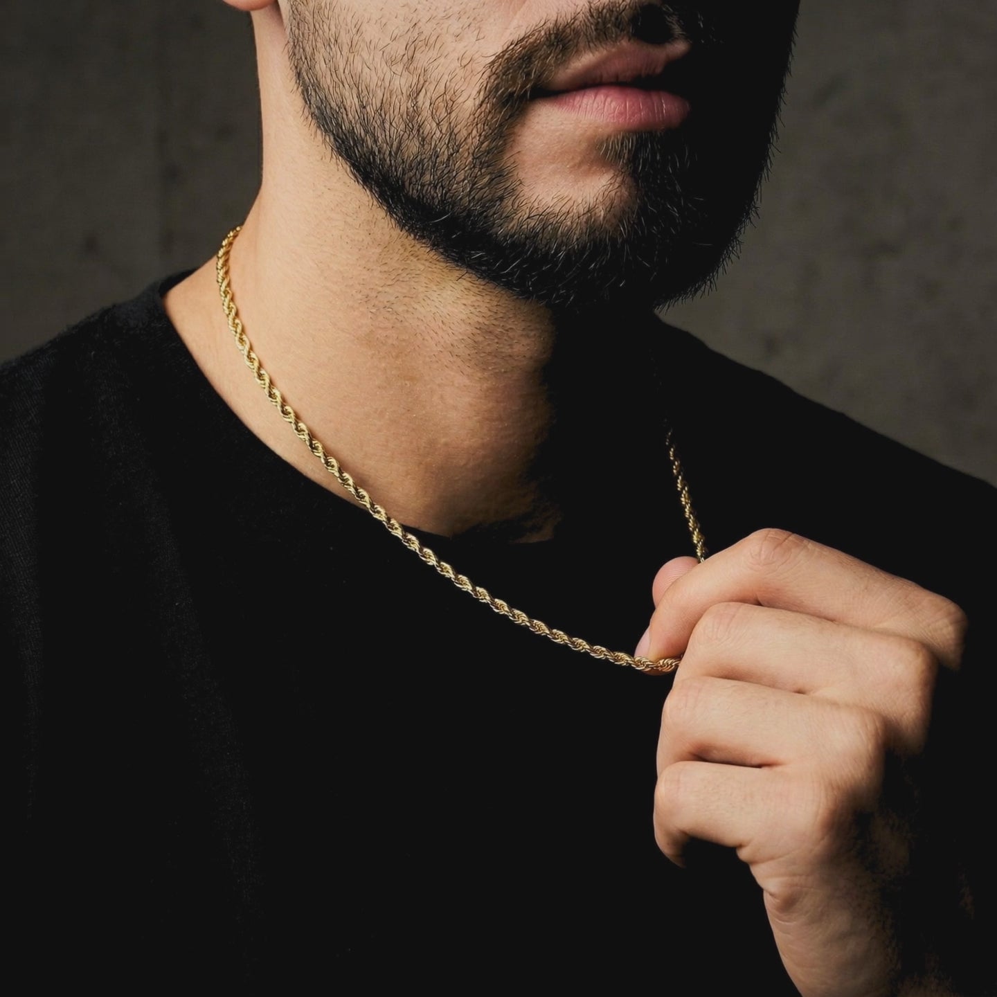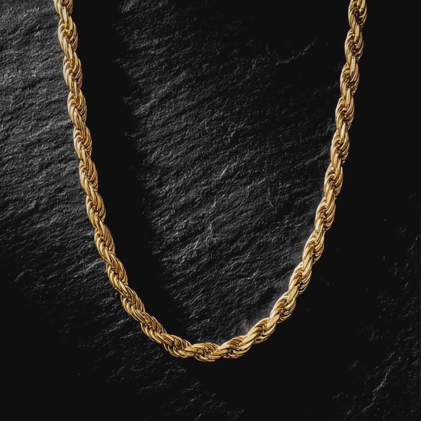The classic rope chain, reimagined for the modern man. This 4mm gold rope chain is crafted from premium materials and engineered for daily wear. Forget about tarnishing or fading – this chain is built to last, guaranteed. Wear it alone or stack it with other pieces for a personalized look.