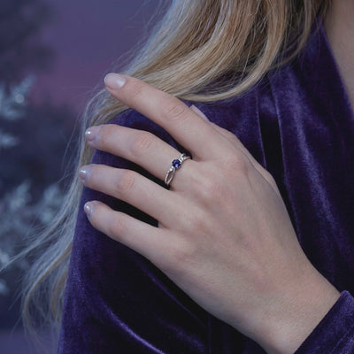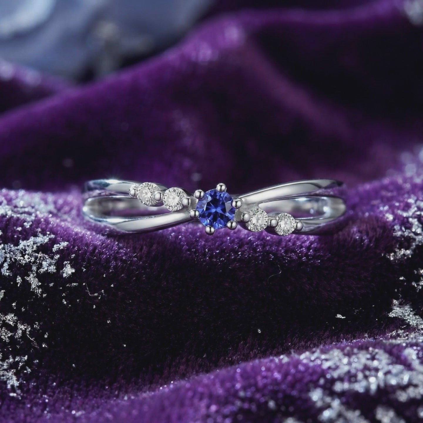 Macro view of the round-cut simulated tanzanite and side stones on an S925 sterling silver crossover ring.
