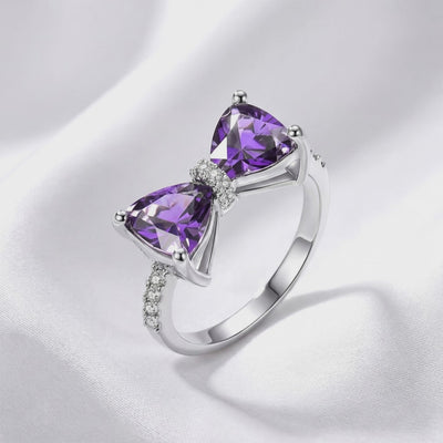 Front view of the sterling silver Violette bow ring with trillion-cut purple simulated amethysts.