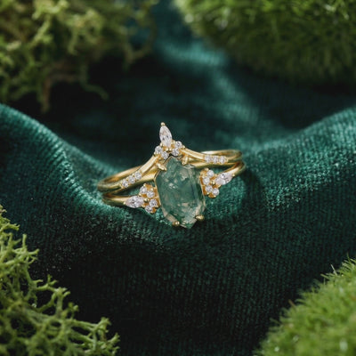 Designed for the woman who walks her own path, the striking hexagonal cut offers a modern, geometric edge to the organic softness of the stone. Paired with a matching band, this set serves as a constant reminder of your connection to nature, whether worn as a unique engagement ring or a daily statement of grounding energy.