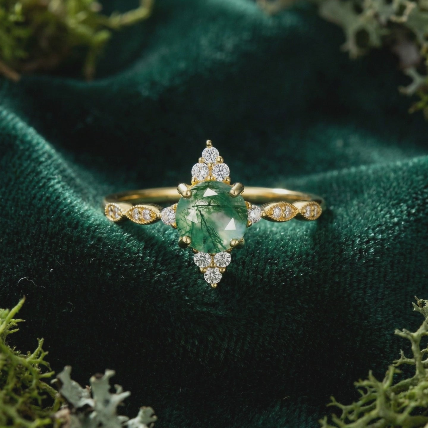 Gaze into the depths of this Natural Moss Agate Sunburst Ring and you’ll see more than just a gemstone—you’ll see a miniature landscape of ancient earth bathed in golden light. Swirls of deep forest green dendritic inclusions float within the translucent chalcedony quartz, creating a mesmerizing, one-of-a-kind pattern that is yours and yours alone.