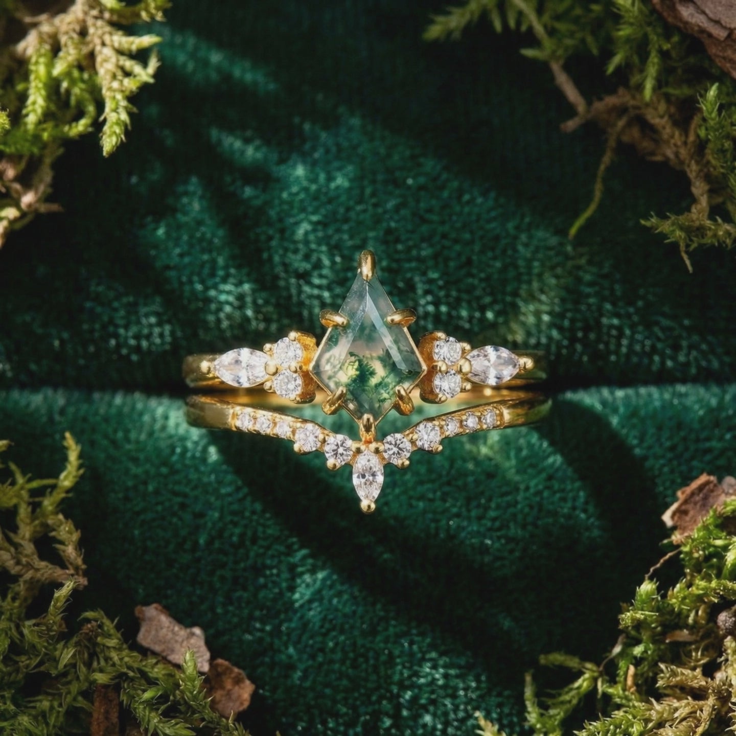 Designed for the woman who walks her own path, this vintage-inspired duo set features a 100% natural moss agate center stone paired with a matching band, offering a complete, grounded look. Whether worn as a unique engagement stack or a daily statement of connection, this piece serves as a constant reminder of your own growth and resilience.