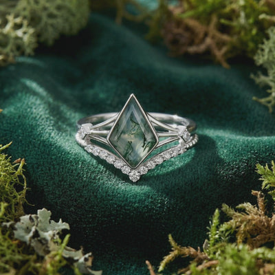 Gaze into the depths of this Natural Moss Agate V Cut Solitaire Ring Set and you’ll see more than just a gemstone—you’ll see a miniature landscape of ancient earth. Swirls of deep forest green dendritic inclusions float within the translucent chalcedony quartz, creating a mesmerizing, one-of-a-kind pattern that is yours and yours alone.