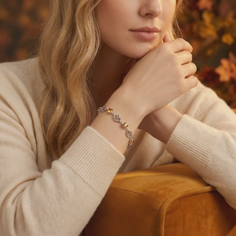 Macro view of square-cut simulated topaz stones and silver heart links on the Amantelle sterling silver bracelet.