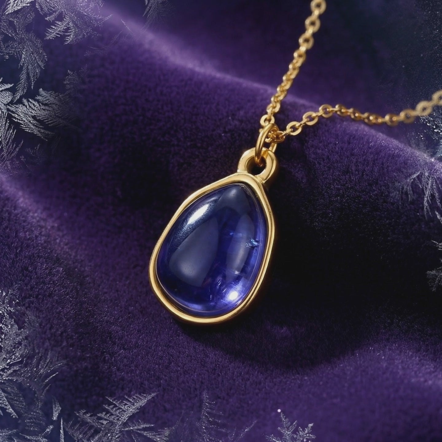 Macro shot of a teardrop simulated tanzanite in a gold bezel setting on purple velvet with snowflakes.