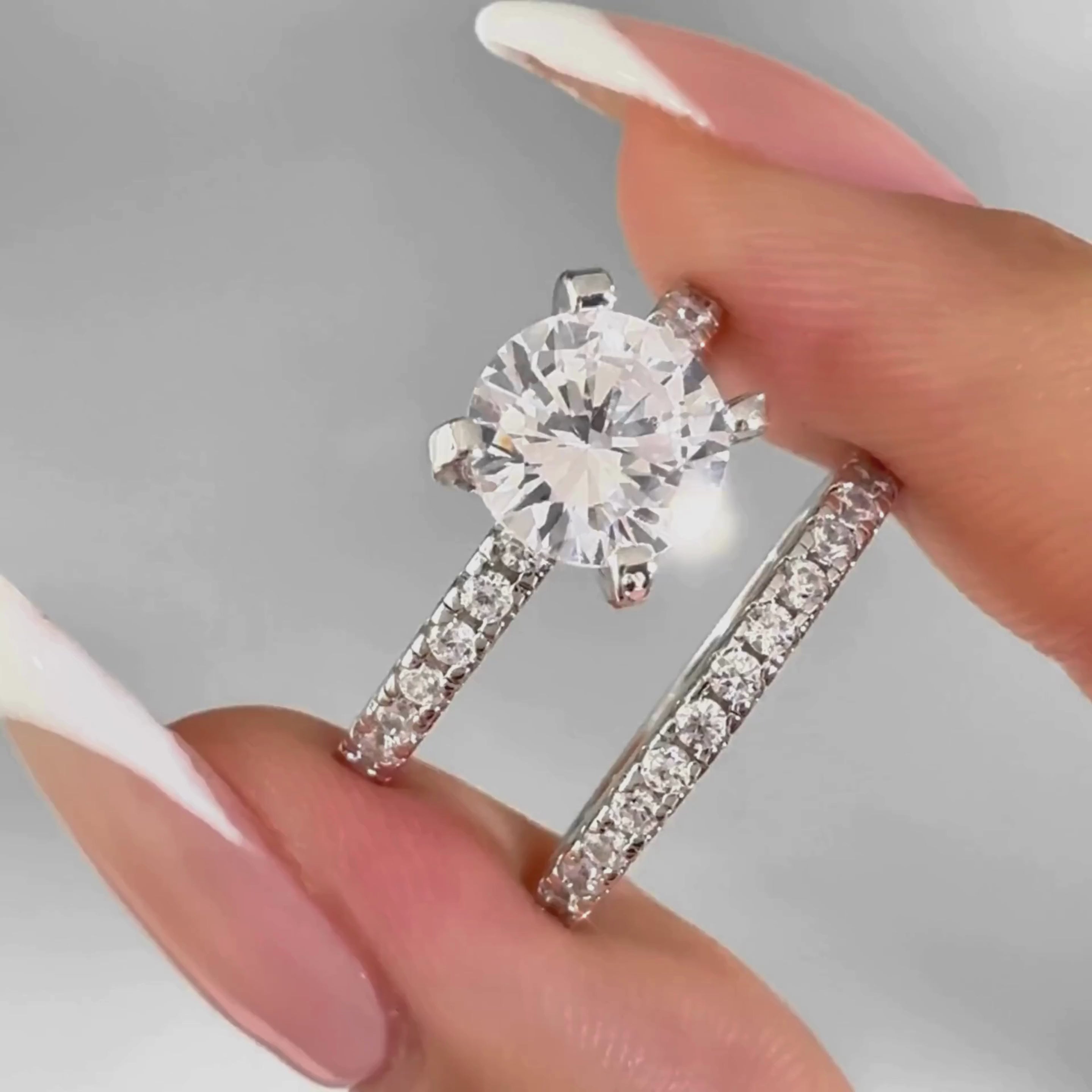 The Angel-Rose combines elegance with a romantic touch. Crafted from S925 sterling silver with 18k rose gold plating, this classic double pavé solitaire ring features round-cut simulated diamonds in prong and pavé channel settings. The Angel is also available in a silver finish.