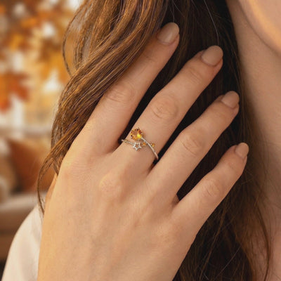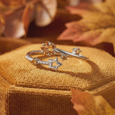 Sterling silver Astralis Star ring with golden simulated topaz stones on a warm velvet surface with autumn leaves.
