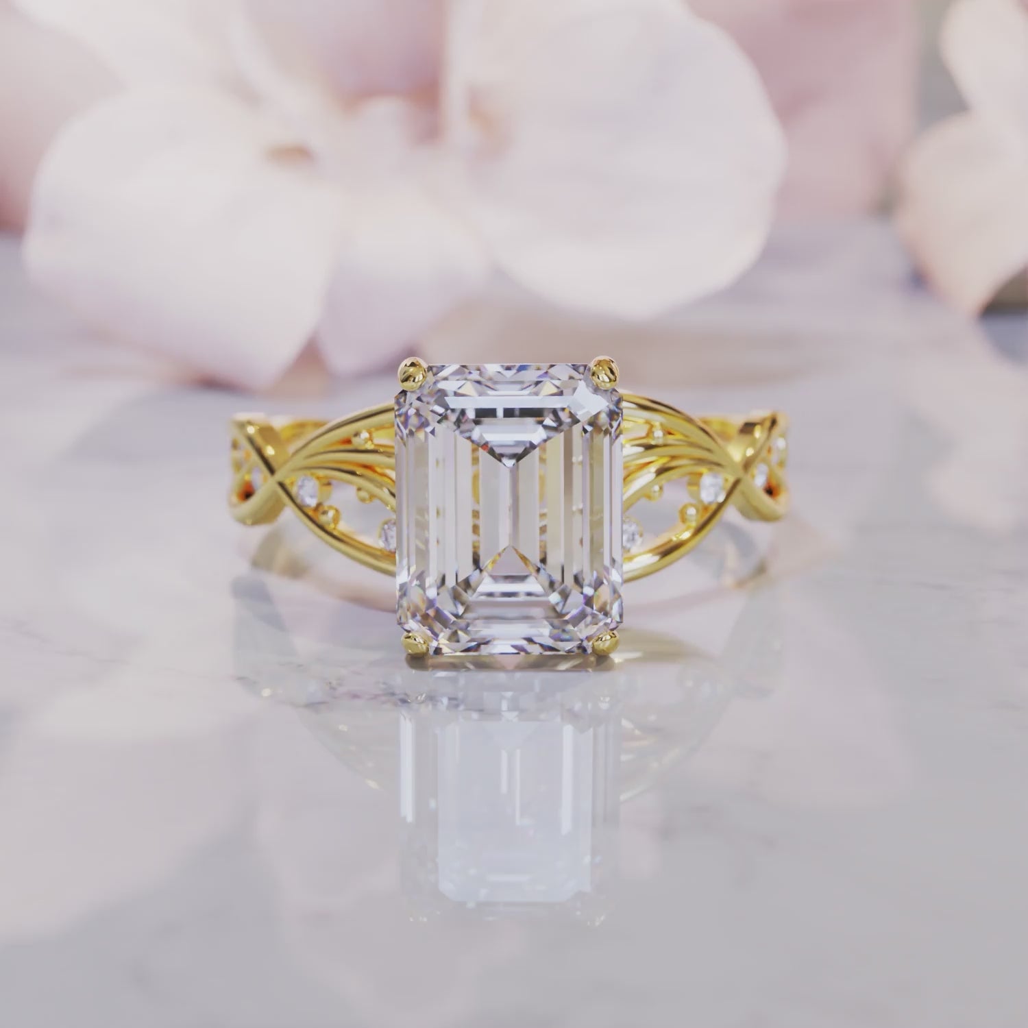 The Blossom Ring features a stunning 3-carat ideal emerald-cut moissanite stone, celebrated for its bold, vintage-inspired elegance. With flawless (FL, IF) clarity and a D-grade colorless quality, this moissanite rivals the brilliance and fire of the finest diamonds—without the cost or compromise.