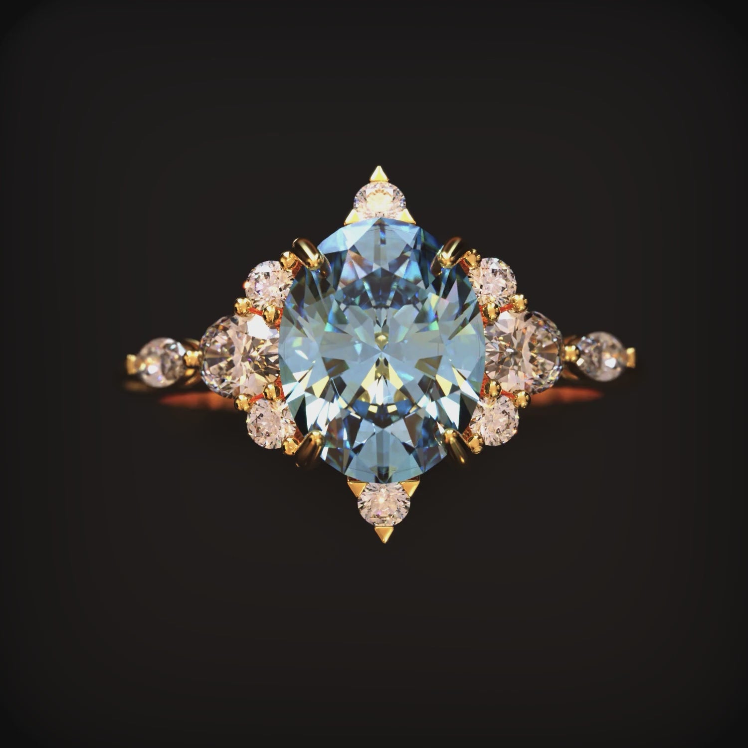 - Stones: Blue ethical high-grade moissanite