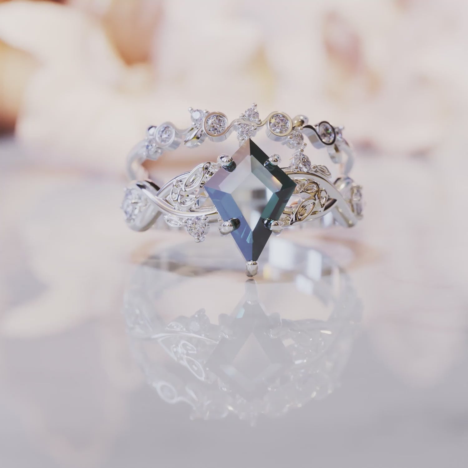 Meet The Chiara, a stunning two-band ring set that combines vintage elegance with modern magic. One band features a brilliant 2-carat kite-cut Alexandrite that changes its colors with the light, while its matching band is adorned with sparkling simulated diamonds for a touch of classic glamour.
