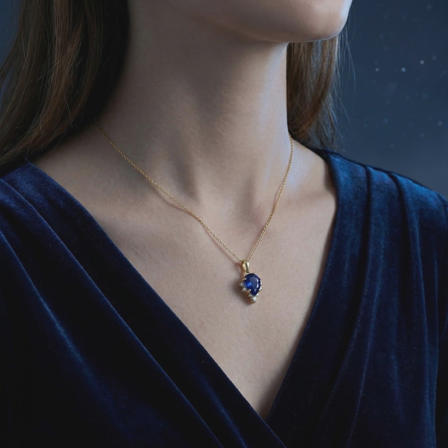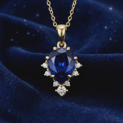 Detailed view of a pear-shaped royal blue sapphire pendant with accents on an 18K gold vermeil chain.