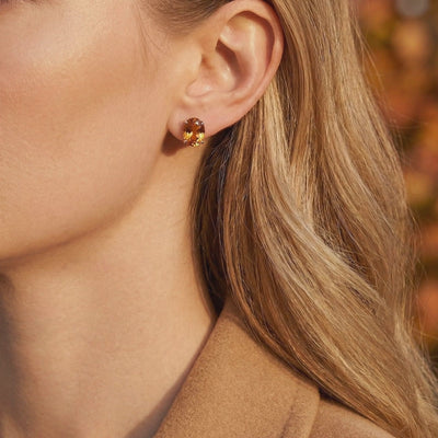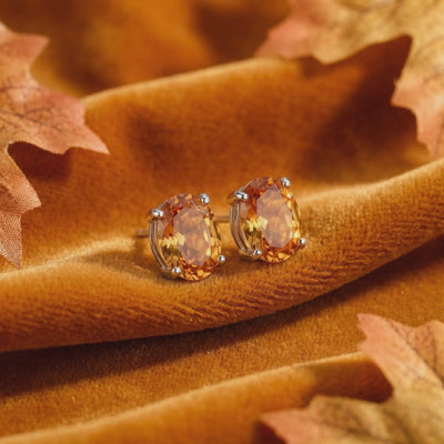 Macro view of oval cut honeyed simulated topaz stud earrings in silver four-prong settings.