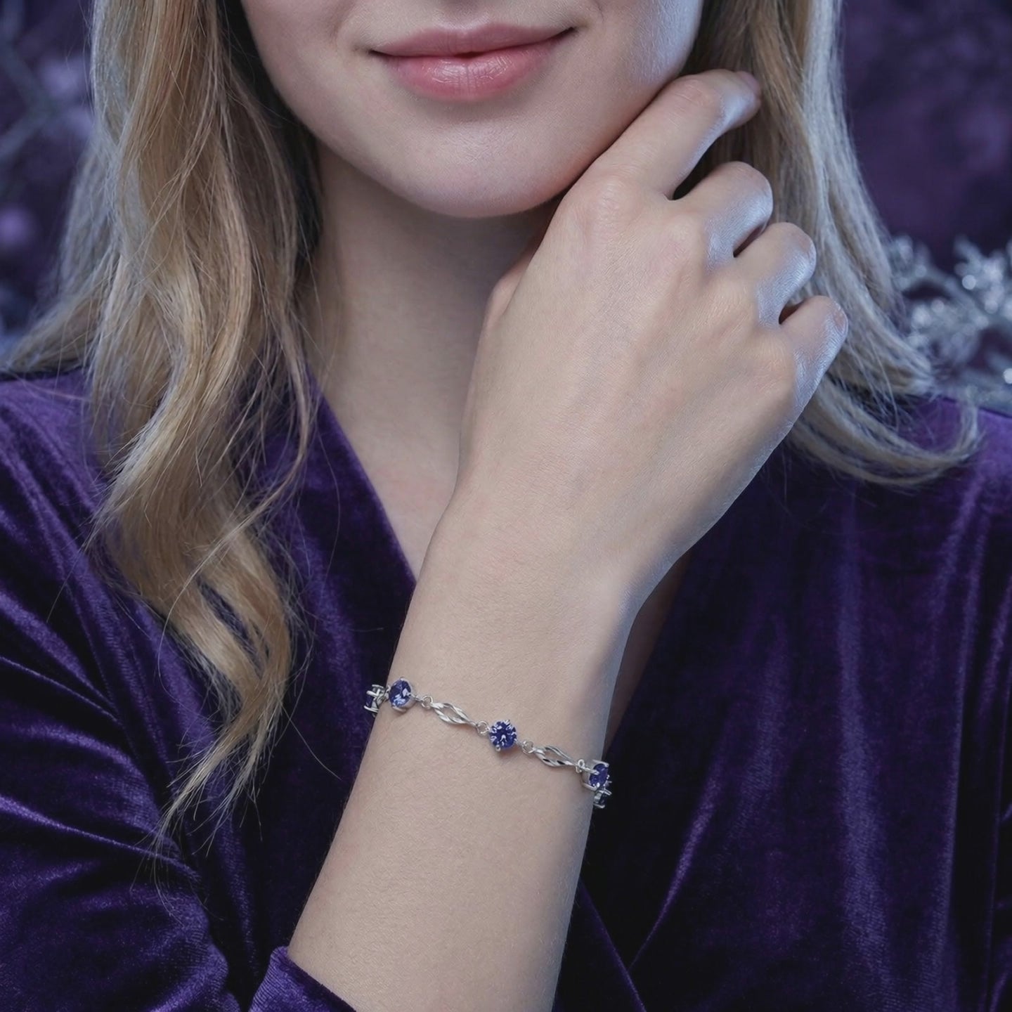 Macro view of a sterling silver station bracelet with round-cut blue-violet simulated tanzanite stones.