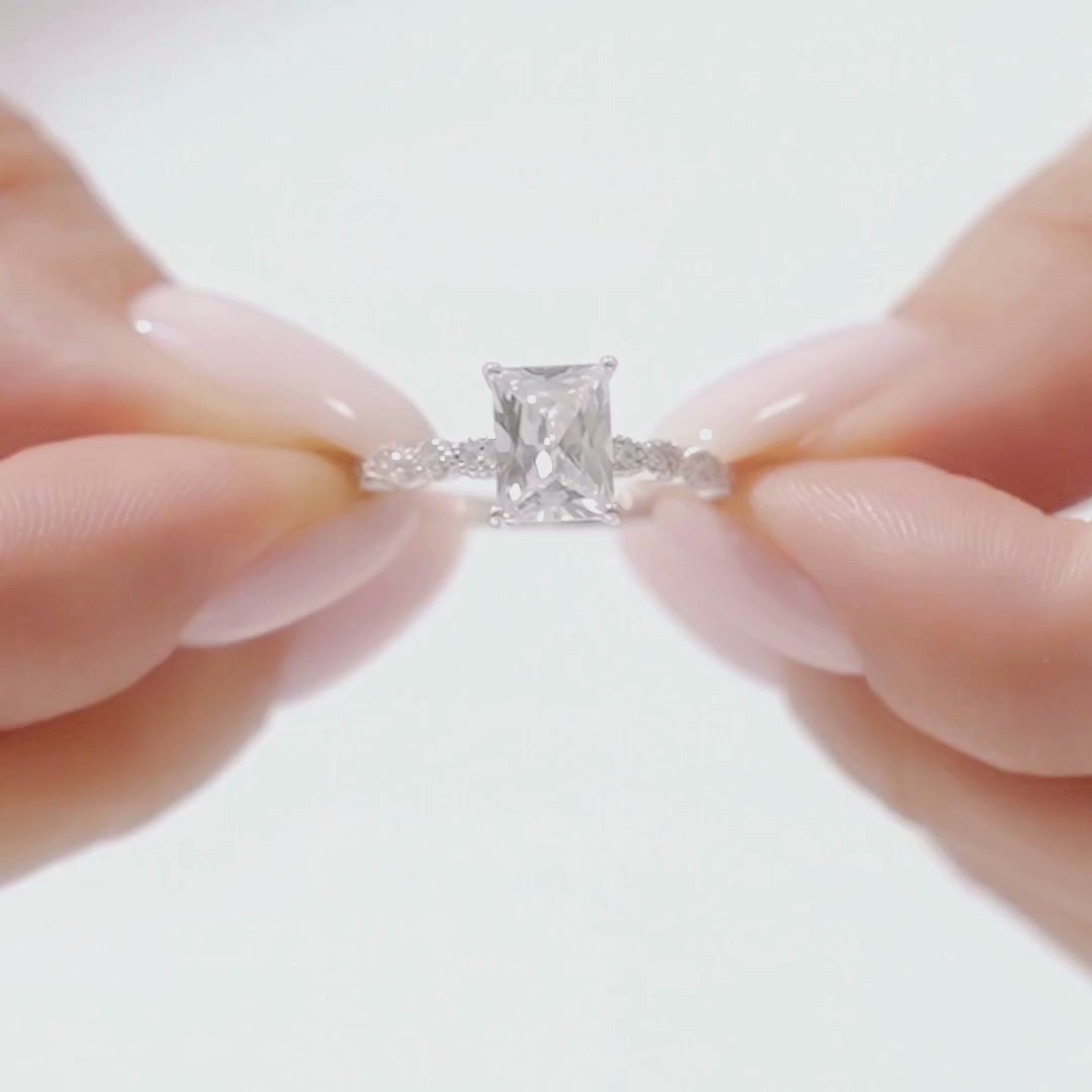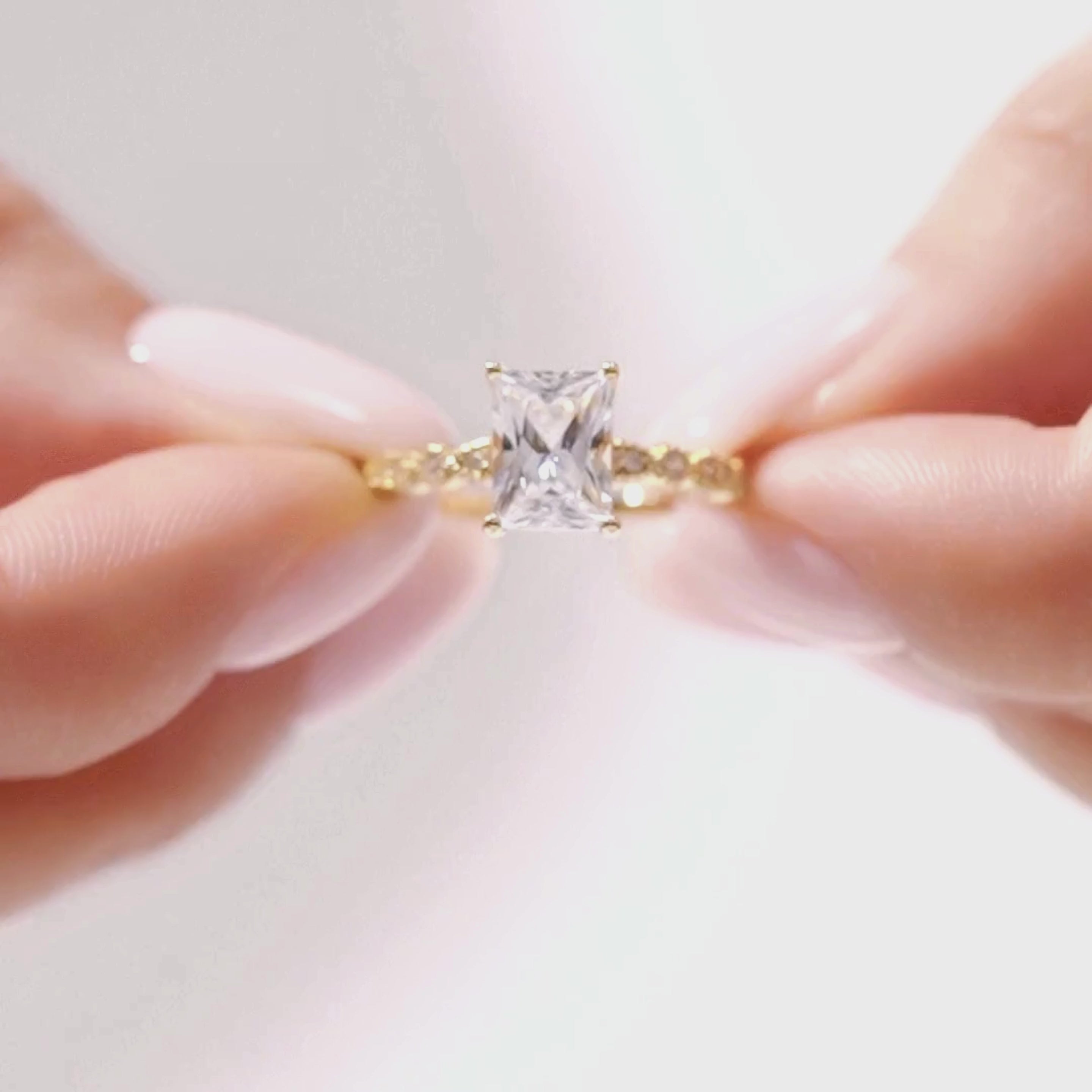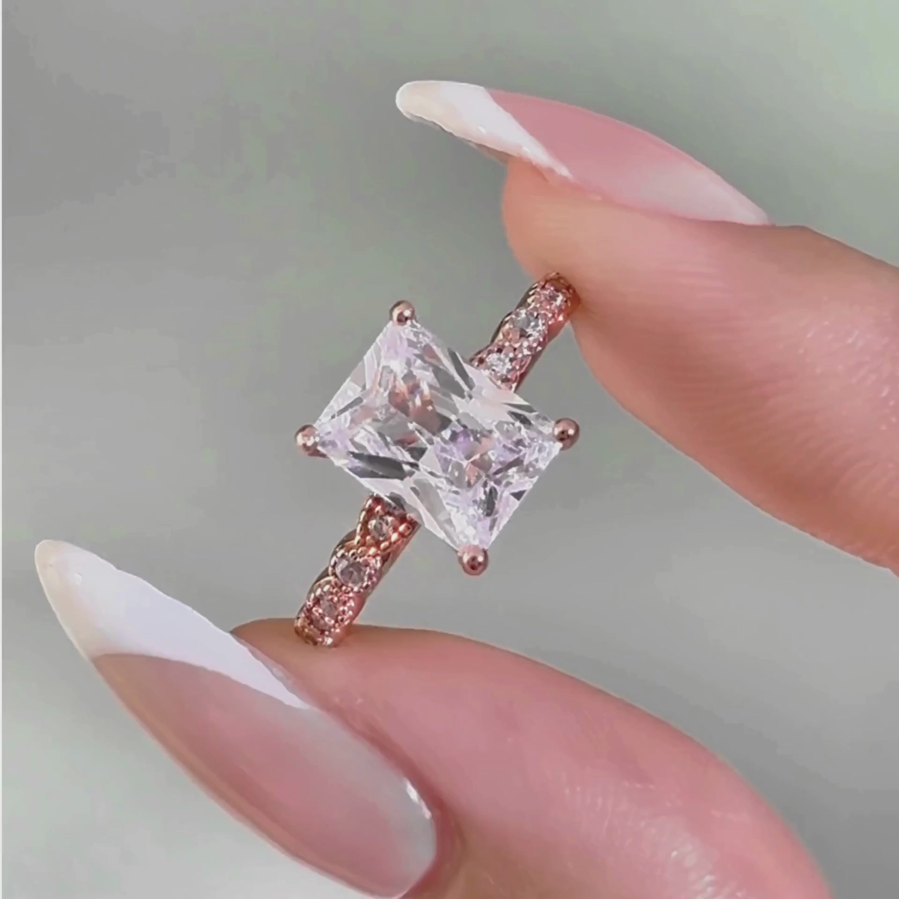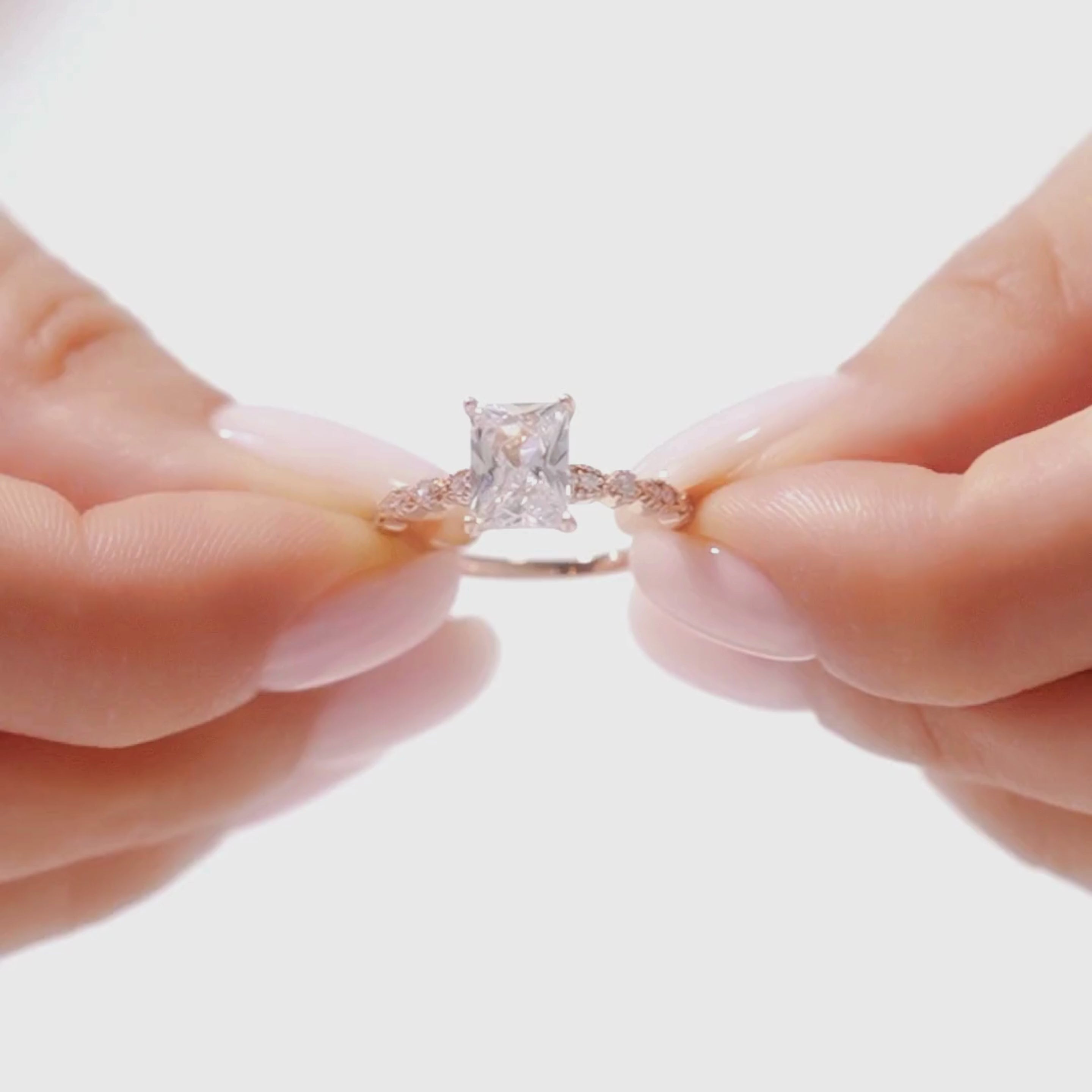 The Solace-Rose combines elegance with a touch of romance. This half-eternity classic solitaire ring is crafted from S925 sterling silver with 18k rose gold plating, featuring an emerald-cut lab grown diamond in prong and bezel settings.
