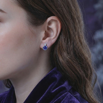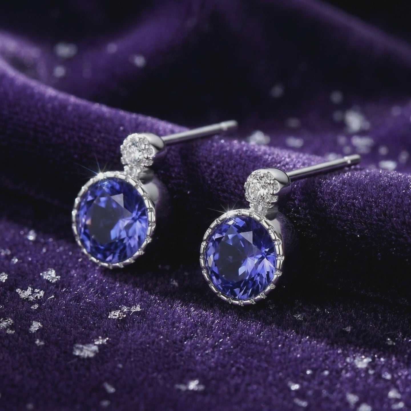 Front view of round simulated tanzanite and silver drop earrings resting on textured purple velvet.