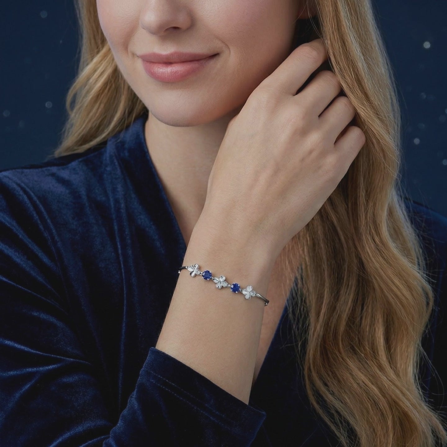 Close-up of the sterling silver clover motifs and round royal blue simulated sapphires on a velvet surface.