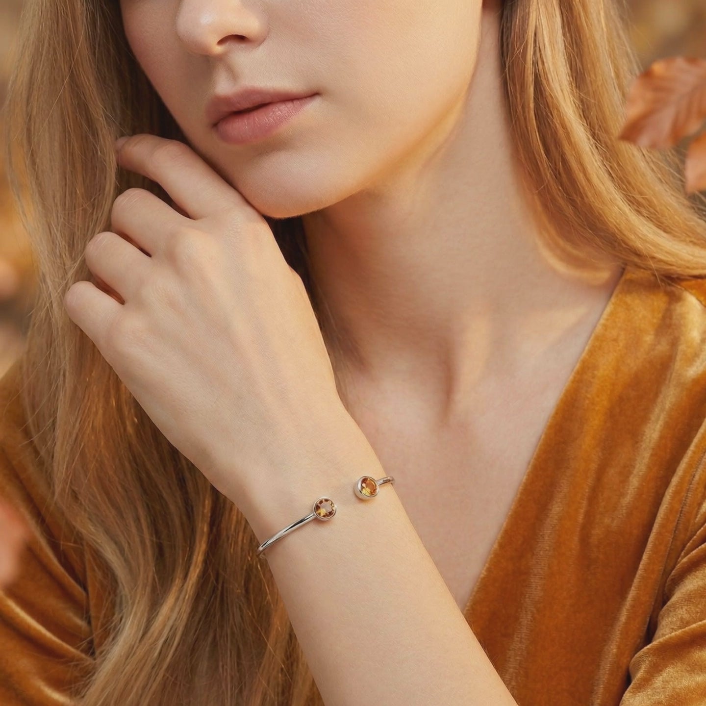 Model wearing the silver stainless steel Vesperelle cuff with round honeyed simulated topaz stones on her wrist.