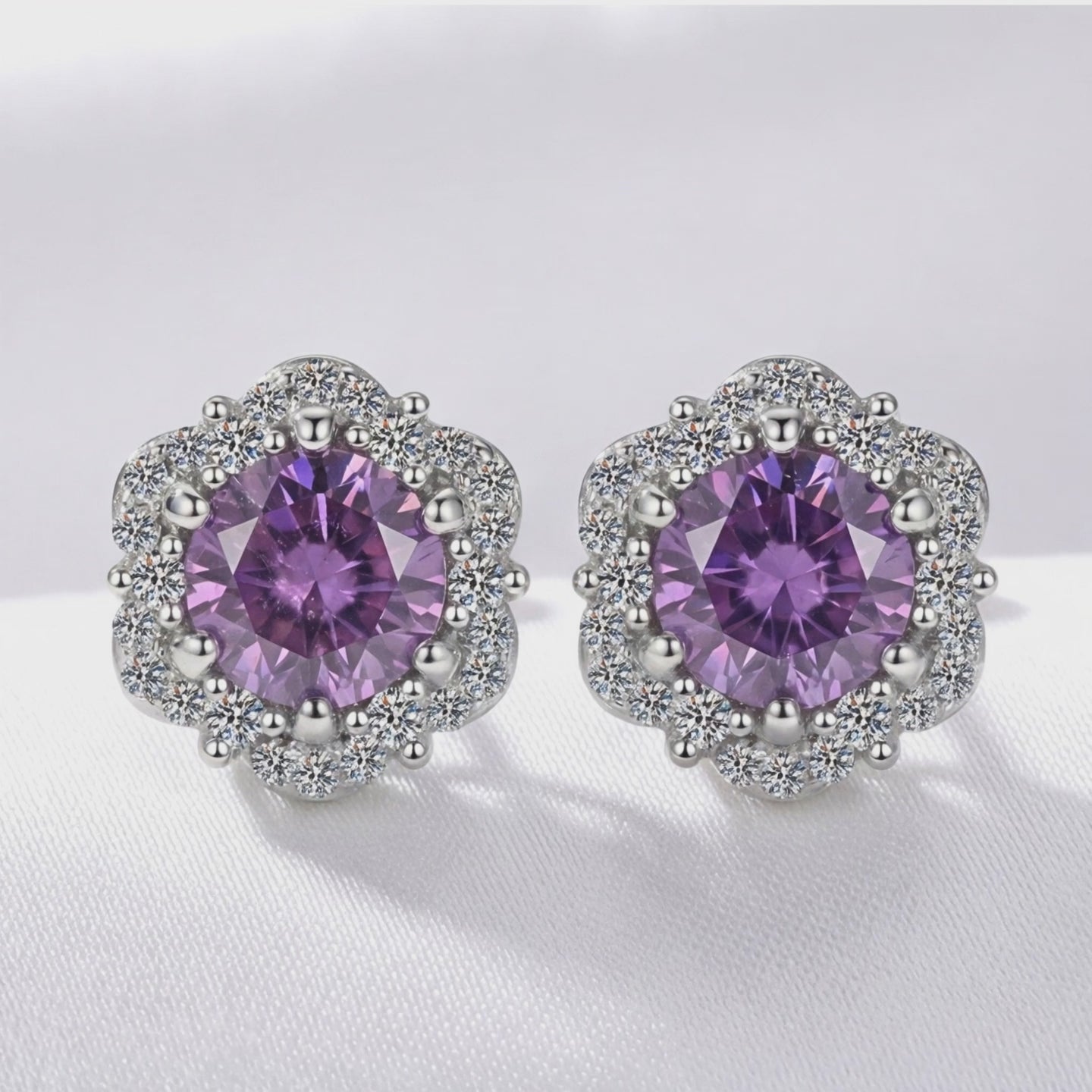 Angled view of round cut simulated amethyst floral halo stud earrings in S925 sterling silver on white fabric.