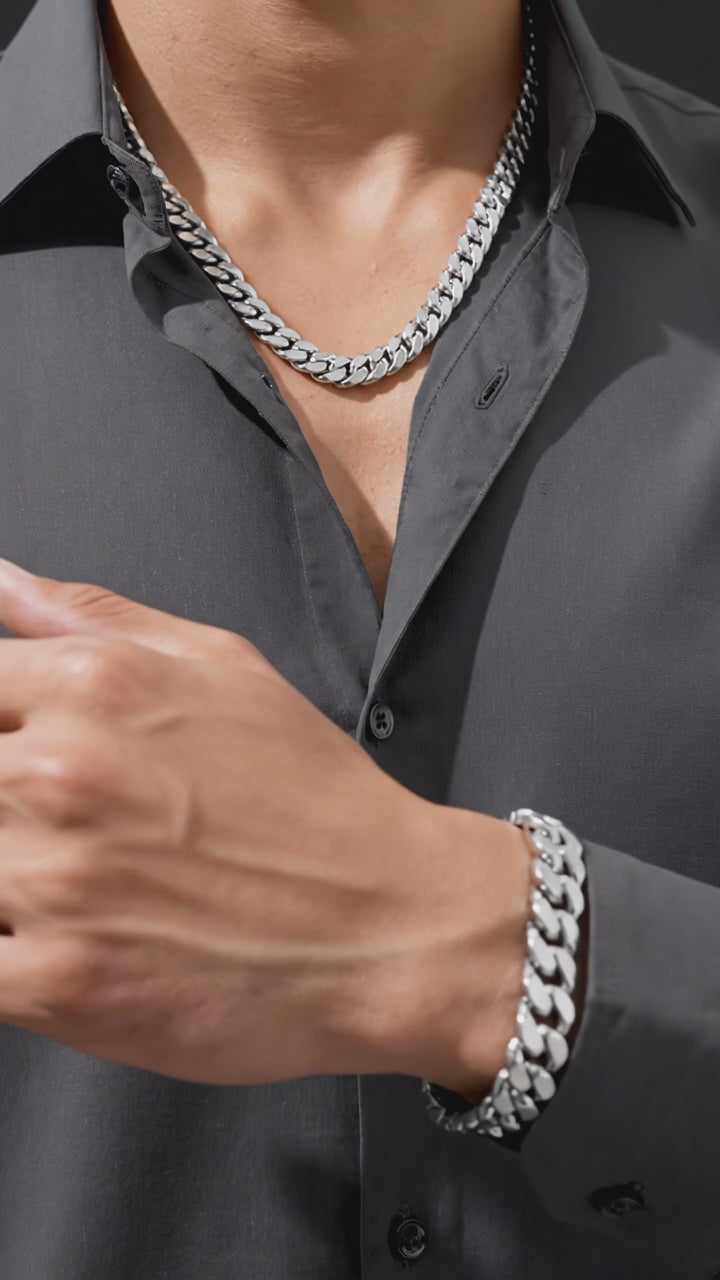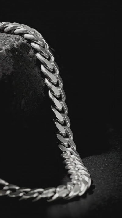 Silver 8mm stainless steel Cuban link chain laid on a dark textured slate background.