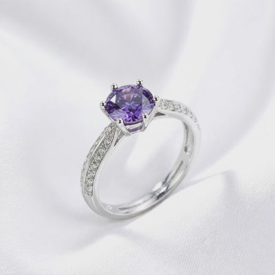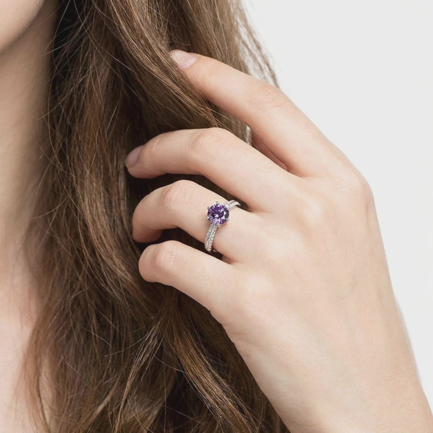 Macro view of a round-cut purple simulated amethyst in a sterling silver milgrain split-shank setting.