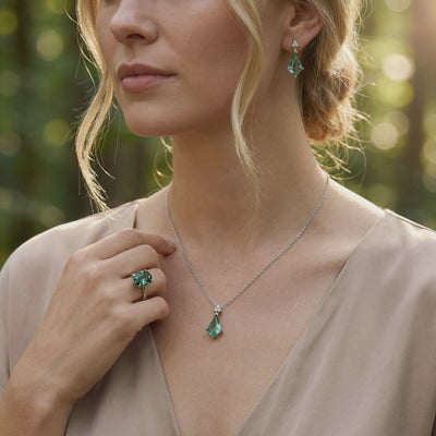 Gaze into the depths of The Aurora Jewelry Set and you’ll see more than just accessories—you’ll see a miniature landscape of ancient earth. This curated collection features a stunning oval-cut Natural Moss Agate ring, flanked by geometric moss agate drop earrings and a matching pendant. Swirls of deep forest green dendritic inclusions float within the translucent chalcedony quartz, creating a mesmerizing, one-of-a-kind pattern that is yours and yours alone.