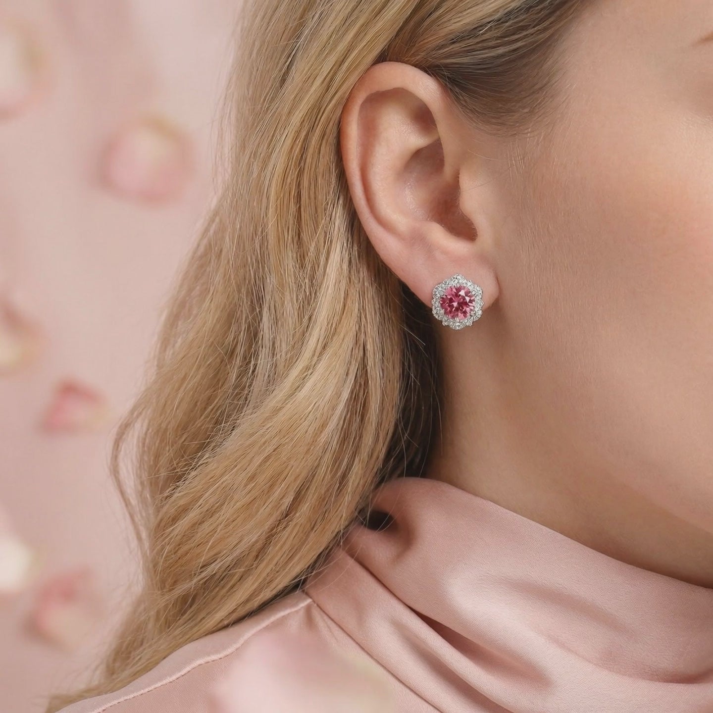Side view of sterling silver halo stud earrings with round raspberry pink tourmaline stones on pink silk.