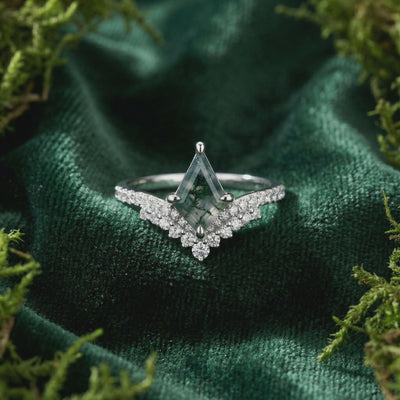 Gaze into the depths of this Natural Moss Agate Kite Cut Ring and you’ll see more than just a gemstone—you’ll see a miniature landscape of ancient earth. Swirls of deep forest green dendritic inclusions float within the translucent chalcedony quartz, creating a mesmerizing, one-of-a-kind pattern that is yours and yours alone.