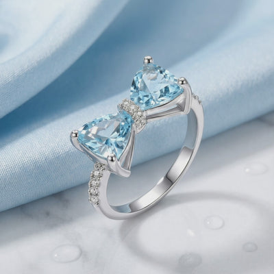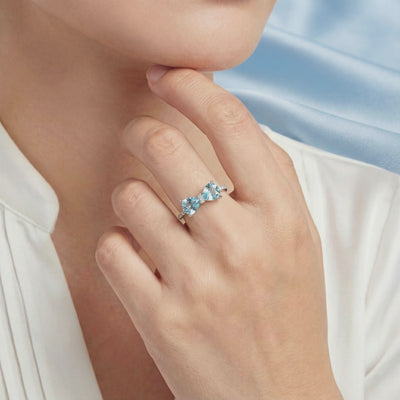 Woman wearing a simulated aquamarine bow ring in sterling silver, showcasing the trillion-cut stones.