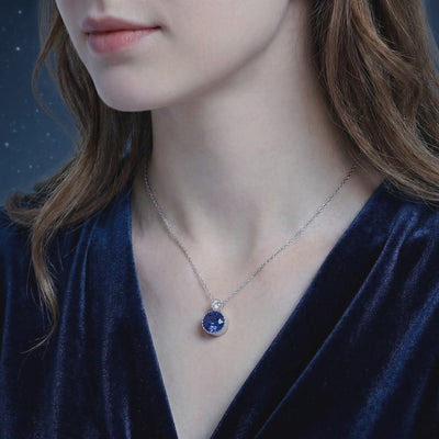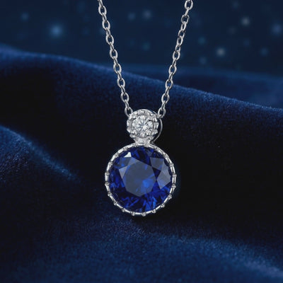 Side profile of the Caelis round simulated sapphire pendant in sterling silver showing the detailed setting.